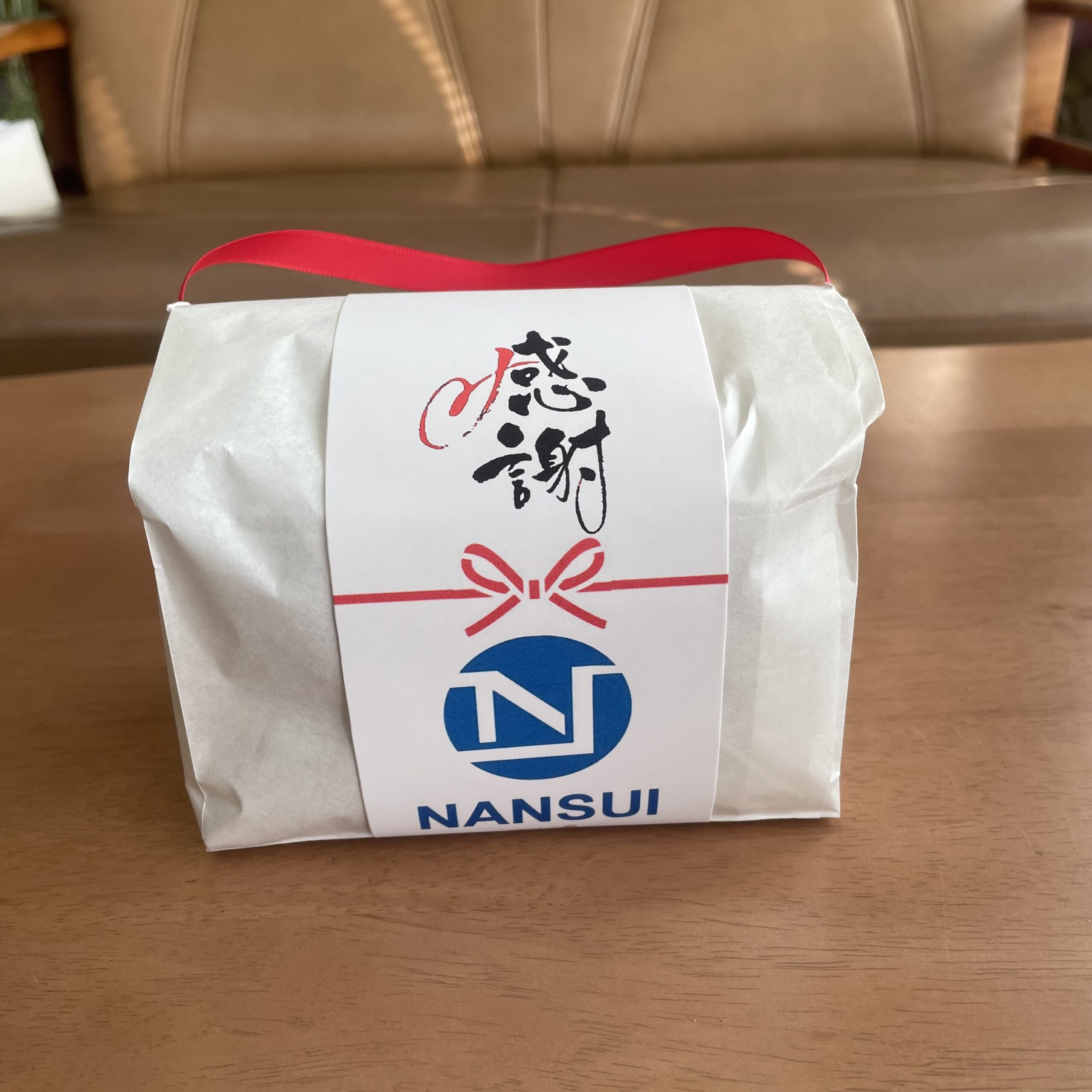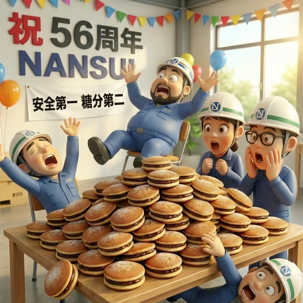 2月16日、南水興業は創立56周年を迎えました。それに先立ち、2月13日には社長より社員全員へ「どら焼き&最中」セットが贈られました。